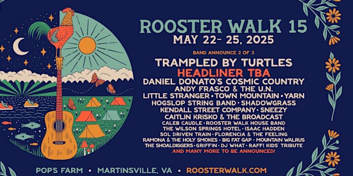 The Rooster Walk 15 Festival will take place from May 22 to May 25, 2025, at Pop’s Farm in Martinsville, Virginia. This exciting four-day event will feature a blend of bluegrass, Americana, rock, and roots music, creating the perfect atmosphere for a Memorial Day weekend celebration. The festival is known for its great music, relaxed vibe, and picturesque outdoor setting, making it one of the best-loved festivals in the region.